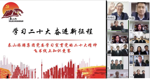 学习贯彻党的二十大精神是tqb谈球吧集团当前的首要政治任务和头等大事,集团党委紧紧围绕泰山文旅集团关于学习宣传贯彻党的二十大“快、实、深”的要求,迅速掀起学习热潮、营造浓厚氛围。鉴于疫情影响,11月3日下午在飞书线上举办了“学习二十大 奋进新征程”知识竞赛,集团及各子公司6支代表队18名选手进行了多轮精彩激烈的答题,拉开了tqb谈球吧集团学习宣传贯彻党的二十大精神系列活动的序幕。