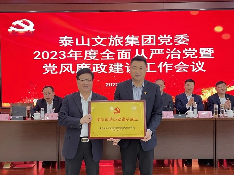 tqb谈球吧集团党委被中共泰安市委授予2022年度“泰安市基层党建示范点”荣誉称号。为充分发挥先进典型示范引领作用,4月8日文旅集团召开2023年度全面从严治党暨党风廉政建设工作会议。泰山文旅集团对旅游集团颁发奖牌,旅游集团党委书记、董事长、总经理张剑作典型发言。