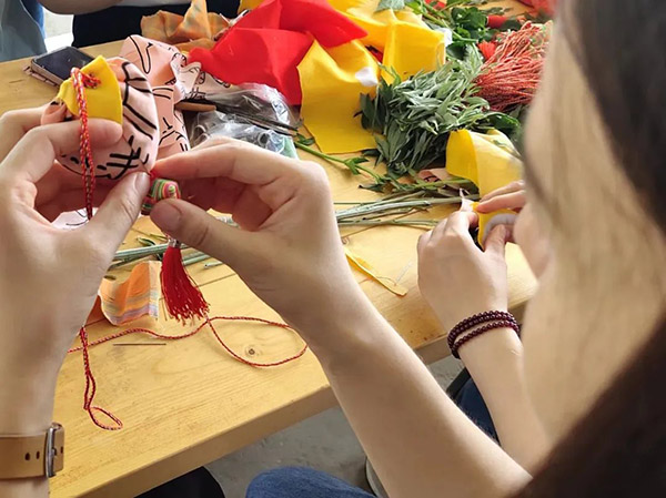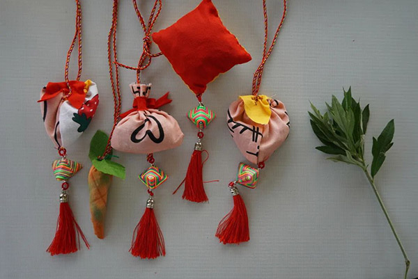 五彩丝,长寿线、缝香囊,一针一线皆心意。大家亲制香囊,缝香为礼。香囊中装有对人体有益的中草药,可驱蚊虫、提精神、防流感。送给家人、同事、朋友,表达自己深深的祝福,具有特殊的意义。