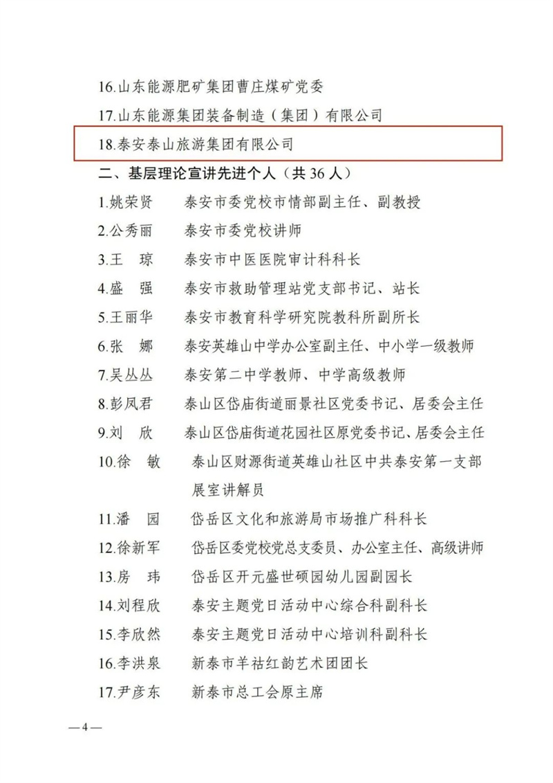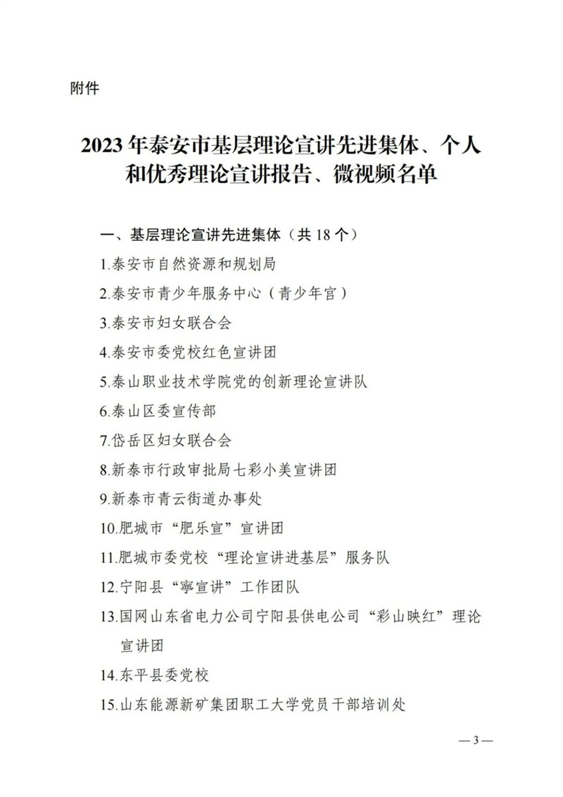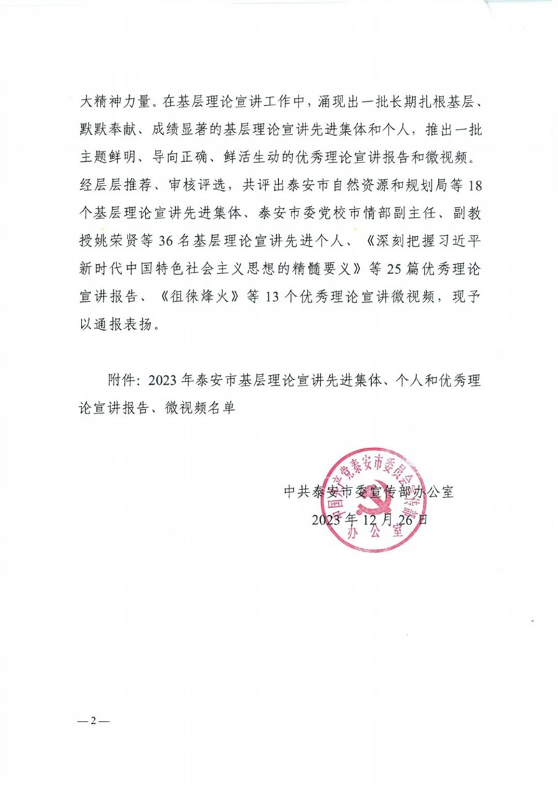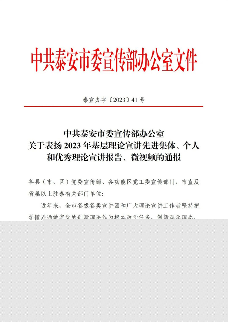 2023年以来tqb谈球吧组织开展了一系列形式多样、富有特色、影响广泛的宣讲活动,经申报推荐,tqb谈球吧荣获中共泰安市委宣传部2023年基层理论宣讲先进集体称号!