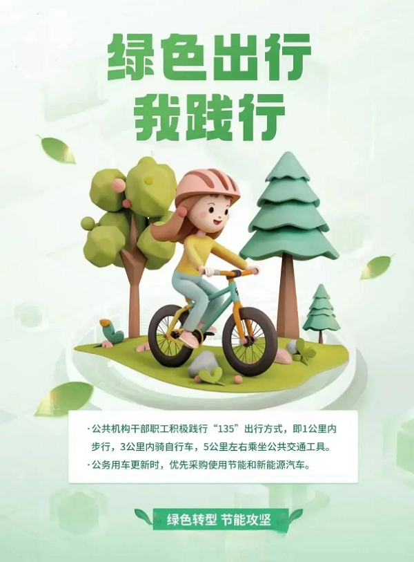 倡导“135”绿色低碳出行(1 公里以内步行,3 公里以内骑自行车,5 公里左右乘坐公共交通工具),进一步增强干部职工的节能意识,以实际行动参与到节能活动中来。