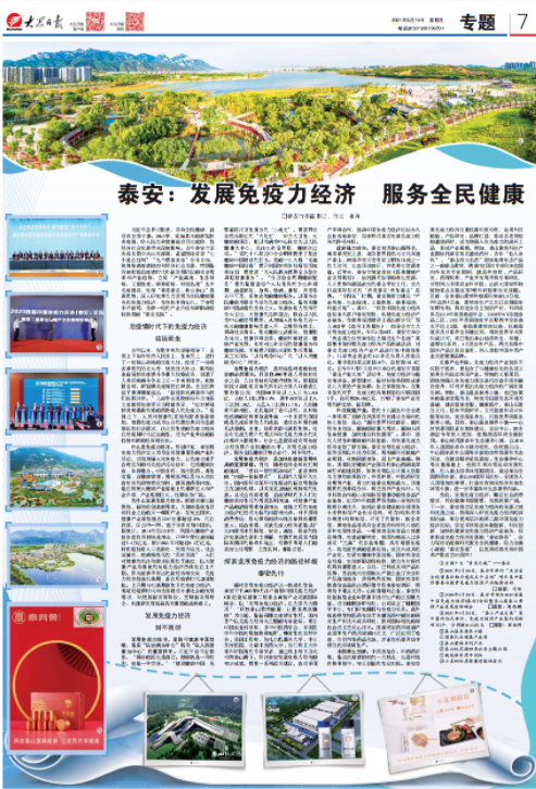 中药养生创新。中西医结合、中西药并用,是这次疫情防控的一大特点,也是中医药传承精华、守正创新的生动实践。泰安发展免疫力经济注重挖潜中医中药,运用科技赋能、产品研发、品牌打造,推动古老传统的道地药材,成为增强人体免疫力的滋补上品,形成产业规模。例如,泰山黄精科技产业园依托泰安知名道地药材、古称“仙人余粮”、“泰山四大名药”国家地理标志产品之一的泰山黄精,聘请7位顶尖专家和36位国内外知名专家顾问,就品种培育、产品研发、药理机理、产业开发等开展专项研究,分别列入中国农业科学院、山农大国家作物植物重点实验室等5所科研院所攻关课题。目前,全市泰山黄精种植面积突破1.5万亩,3年达到4万亩,黄精丝生产工艺已获得国家发明专利,具有完全自主知识产权,科研成果在2019年美国癌症年会、2020年SCI功能食品二区、2021年英国皇家学会期刊中发表高水平论文3篇,泰尚黄黄精丝抗癌、抗病毒效果及日常养生保健应用,得到世界学术界权威认可,现已推出泰山仙草养生、保健、益智3大系列、9大类21种产品,两次获得中国林产品交易会金奖、列入首批中国林草产业关爱健康品牌。